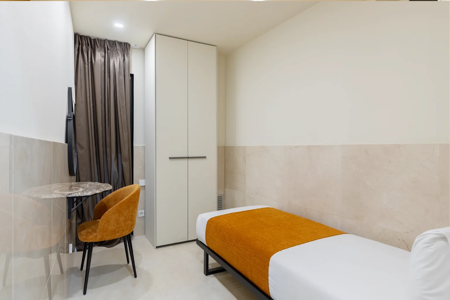 This 75 m² designer apartment, with a private entrance, is located in a historic 19th-century building. The apartment features a spacious living-dining room, three bedrooms, and two bathrooms. The master bedroom comes with a double bed and a private en-suite bathroom. The second bedroom also has a double bed and is separated from the living-dining area by a sliding door, providing both comfort and privacy. The third bedroom is equipped with a single bed, ideal for individual accommodation.