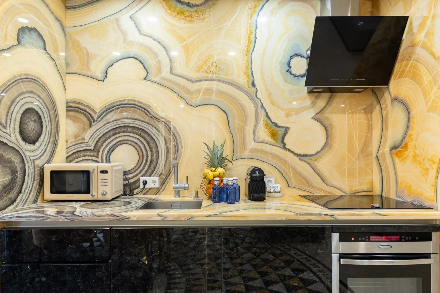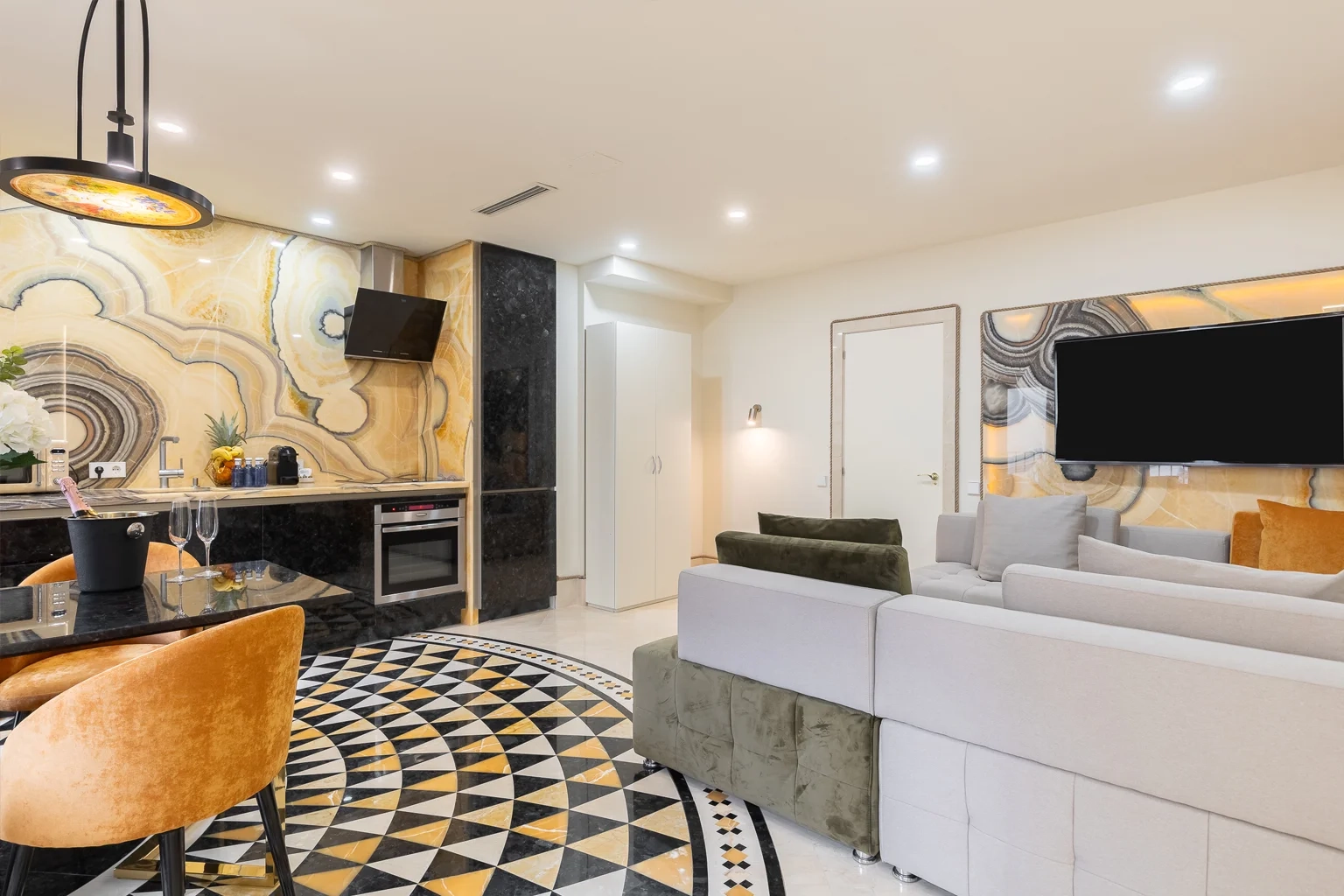 The fully equipped kitchen offers a cooker, refrigerator, dishwasher, microwave, and kitchenware, ensuring you have everything needed for a comfortable stay. Additional amenities include a flat-screen TV with satellite channels, premium soft furnishings, air conditioning, soundproofing, high-speed internet, spacious wardrobes for clothes and luggage, a washing machine, and a well-stocked wine cabinet.